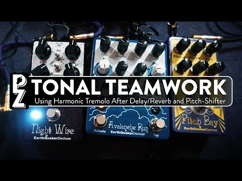 ナイトワイヤーは入力信号をハイパスとローパスフィルターに掛けて後段のLFOを通過させるトレモロです。このペダルは伝統的なハーモニックトレモロの音を襲来しながらフィルターのセンターポイントを動かせる様になっており、 多彩な音作りを可能にしています。フィルターのセンターポイントの動きは3つのモードから選択できます。Manualモードは固定するフィルターのセンターポイントをFrequencyで設定。LFOモードではフィルターは常に動いており、Frequencyで動きの早さを調節。Attackモードはピッキングの強弱でフィルターの動きを変え、Frequencyはフィルターの動きの幅を調整しエンベロープフィルターの様になります。